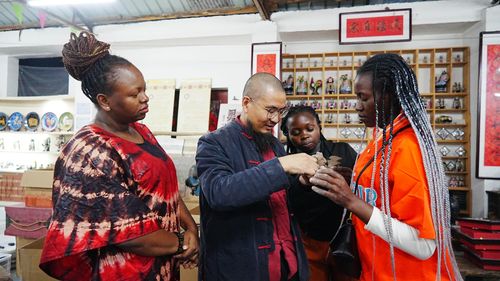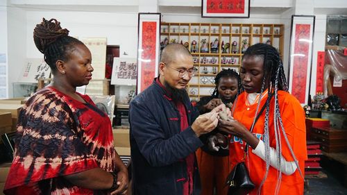 图片说明:2024年10月24日,河南周口,国家级非遗项目淮阳泥泥狗省级代表性传承人邵波正在给外国留学生指导捏制泥泥狗泥塑龙。