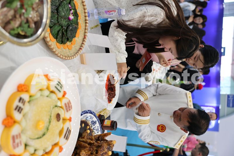 图片说明:2024年10月25日,参观者在菜品展示区品尝特色美食。