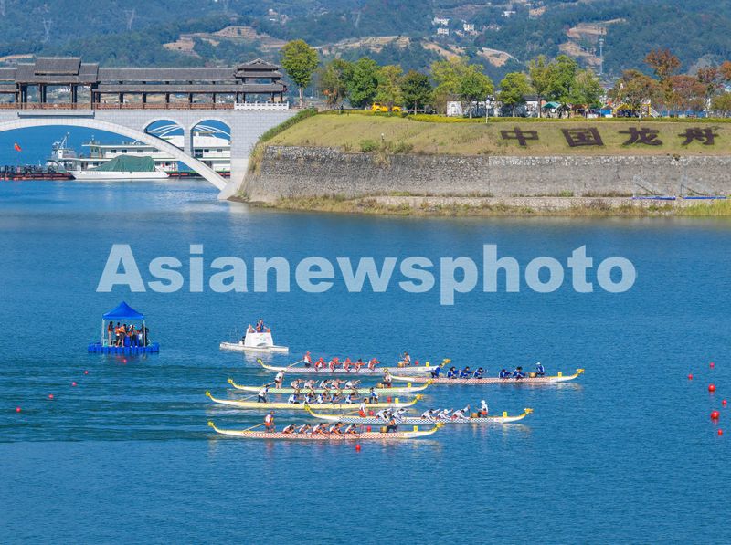 2024年10月25日,参赛运动员在三峡大坝前湖北省宜昌市秭归县徐家冲港湾参加龙舟比赛。