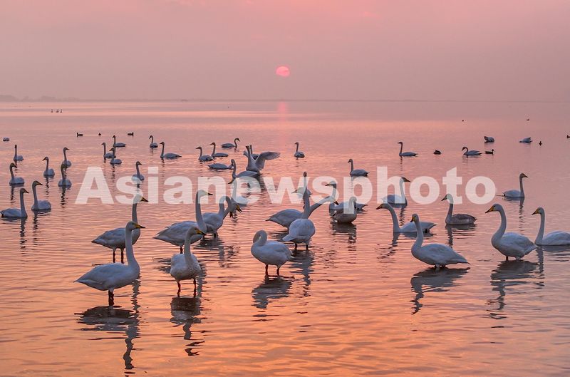 图片说明:2024年10月26日清晨,山东省荣成大天鹅国家级自然保护区天鹅湖畔旭日东升,薄雾弥漫,成群大天鹅在湖中游弋、觅食。