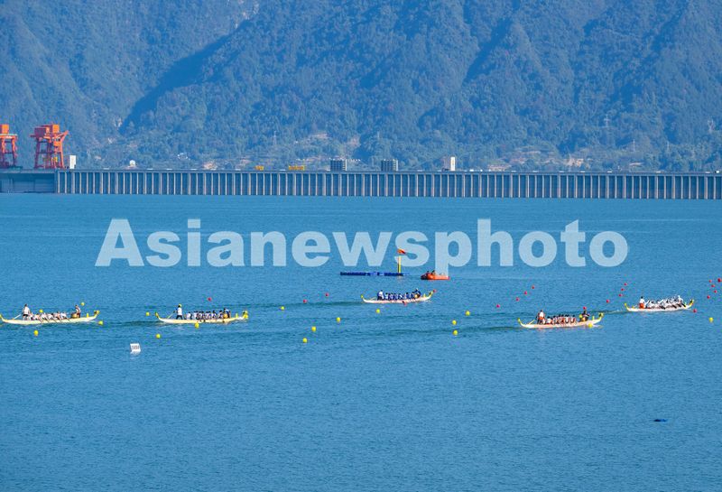 2024年10月25日,参赛运动员在三峡大坝前湖北省宜昌市秭归县徐家冲港湾参加龙舟比赛。