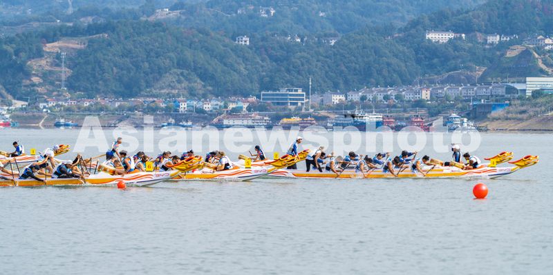 2024年10月26日,参赛运动员在三峡大坝前湖北省宜昌市秭归县徐家冲港湾参加龙舟比赛。