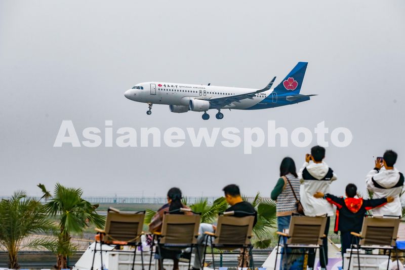2024年10月26日,重庆,市民在超级加倍飞行营地主题露营基地内观看即将着陆在重庆江北国际机场的飞机。