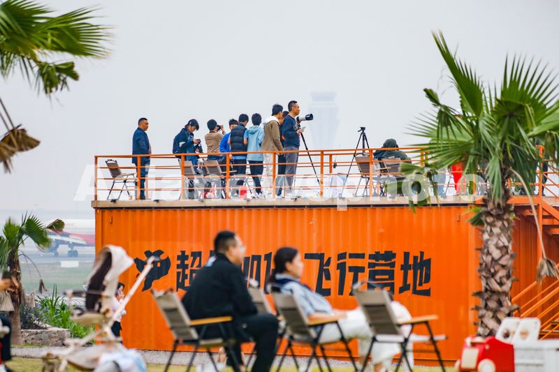 2024年10月26日,重庆,市民在超级加倍飞行营地主题露营基地内观看即将着陆在重庆江北国际机场的飞机。