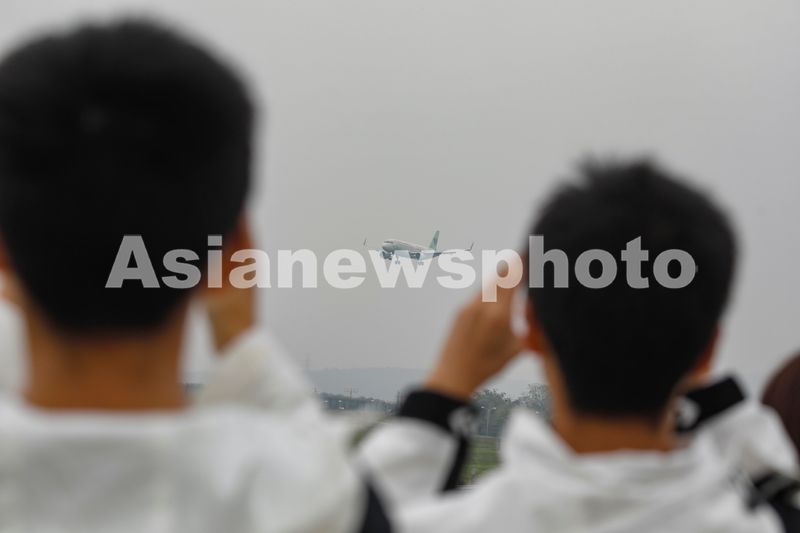 2024年10月26日,重庆,市民在超级加倍飞行营地主题露营基地内观看即将着陆在重庆江北国际机场的飞机。