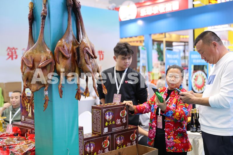 图片说明:2024年10月25日,2024中国厨师节博览会上,宜宾当地土特产高县余三姐的板鸭很受欢迎。