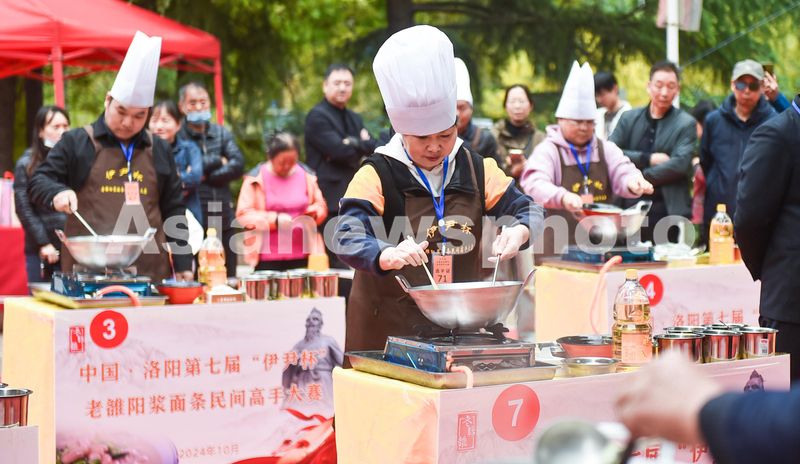 图片说明:2024年10月27日,参加河南省洛阳市第七届老雒阳浆面条民间高手大赛的选手在制作浆面条。