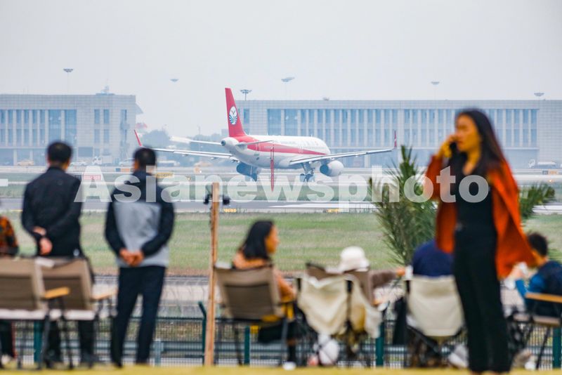 2024年10月26日,重庆,市民在超级加倍飞行营地主题露营基地内观看即将着陆在重庆江北国际机场的飞机。
