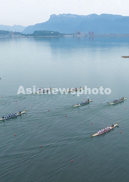 2024年10月26日,参赛运动员在三峡大坝前湖北省宜昌市秭归县徐家冲港湾参加龙舟比赛。