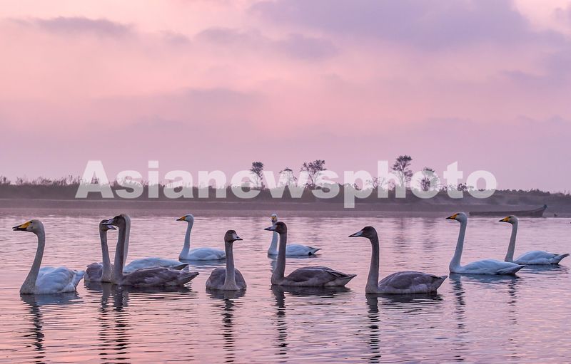 图片说明:2024年10月26日清晨,山东省荣成大天鹅国家级自然保护区天鹅湖畔旭日东升,薄雾弥漫,成群大天鹅在湖中游弋、觅食。