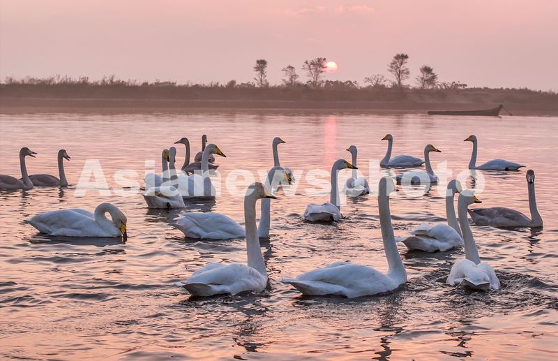 图片说明:2024年10月26日清晨,山东省荣成大天鹅国家级自然保护区天鹅湖畔旭日东升,薄雾弥漫,成群大天鹅在湖中游弋、觅食。