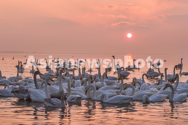 图片说明:2024年10月26日清晨,山东省荣成大天鹅国家级自然保护区天鹅湖畔旭日东升,薄雾弥漫,成群大天鹅在湖中游弋、觅食。