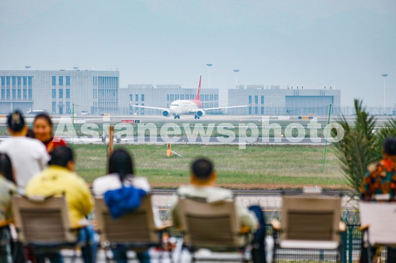 2024年10月26日,重庆,市民在超级加倍飞行营地主题露营基地内观看即将着陆在重庆江北国际机场的飞机。