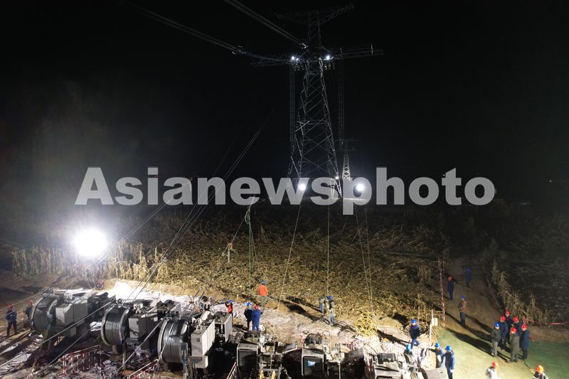 2024年10月25日凌晨,在宁夏中卫市沙坡头区宣和镇境内的宁夏至湖南±800千伏特高压直流工程(宁1标段)跨越银川至兰州高速铁路(K181+829M)施工现场,电力施工人员利用银兰高铁夜间停运期间抓紧开展架线施工。