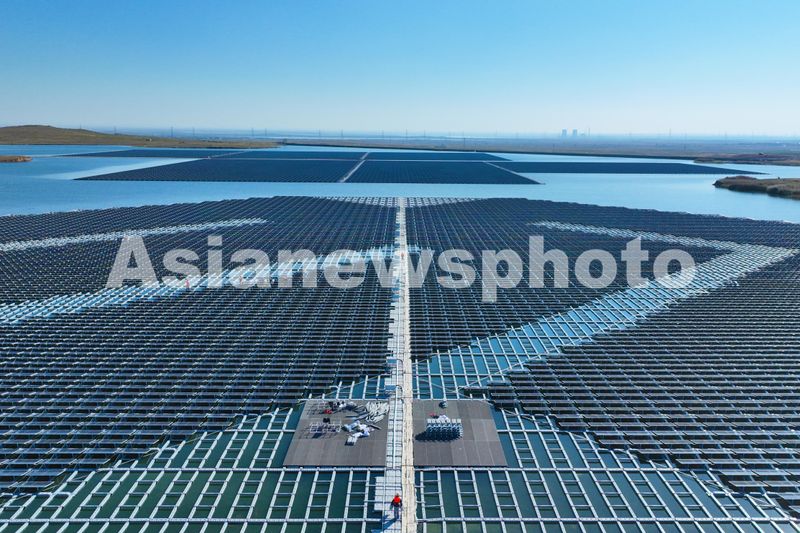 图片说明:2024年10月28日,工人正在位于宁夏回族自治区灵武市马家滩镇的矿井水水域漂浮分布式光伏发电站进行检修,助力能源绿色发展。