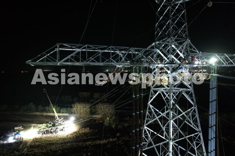 2024年10月25日凌晨,在宁夏中卫市沙坡头区宣和镇境内的宁夏至湖南±800千伏特高压直流工程(宁1标段)跨越银川至兰州高速铁路(K181+829M)施工现场,电力施工人员利用银兰高铁夜间停运期间抓紧开展架线施工。