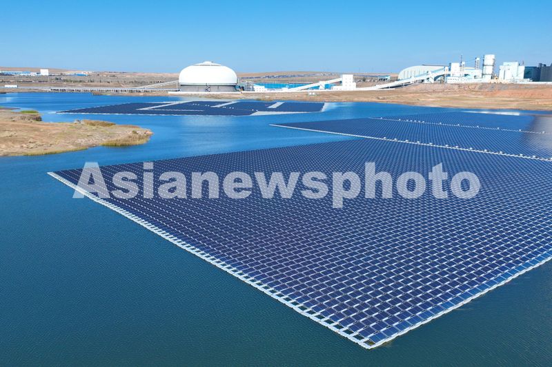 图片说明:2024年10月28日,工人正在位于宁夏回族自治区灵武市马家滩镇的矿井水水域漂浮分布式光伏发电站进行检修,助力能源绿色发展。
