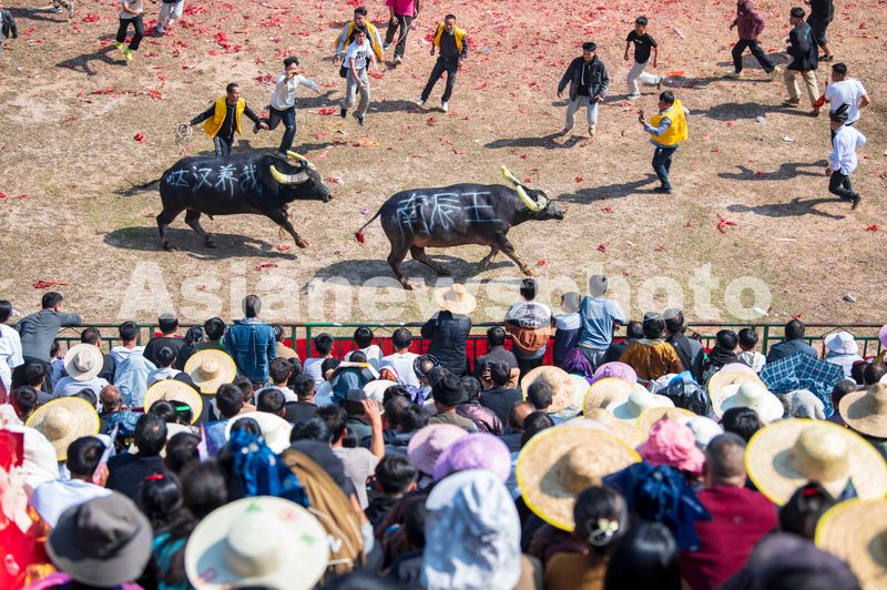 2024年11月2日,在贵州省从江县丙妹镇大塘村松学斗牛塘,两头牛在追逐打斗。