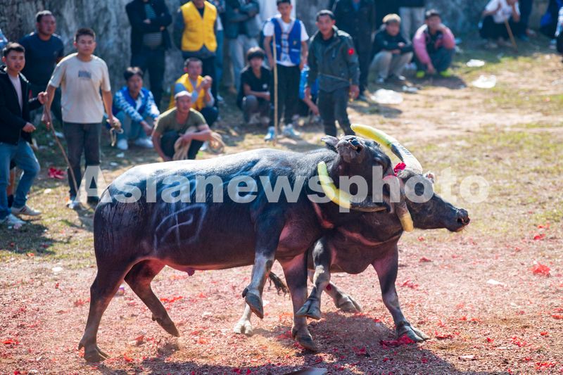 2024年11月2日,在贵州省从江县丙妹镇大塘村松学斗牛塘,两头牛在“激战”。