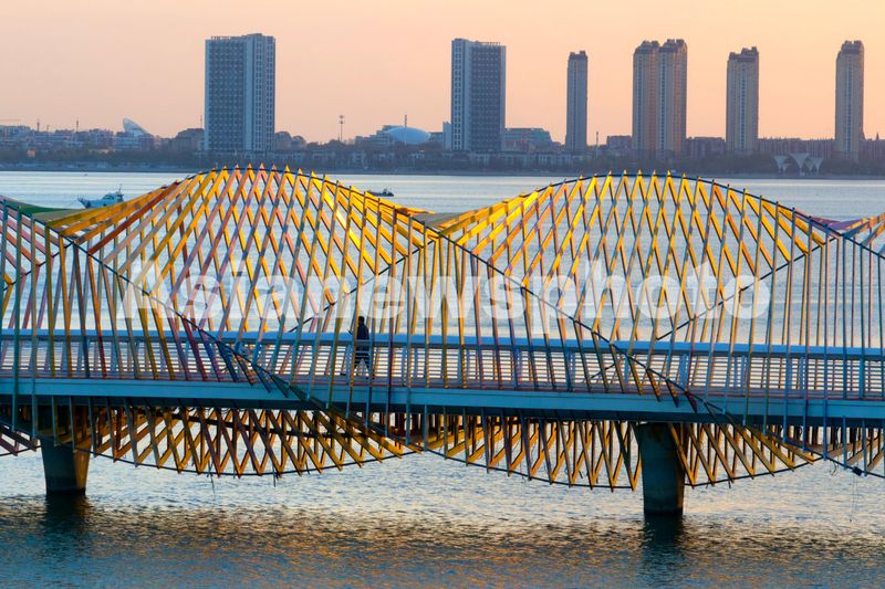 彩虹桥是青岛西海岸新区为唐岛湾旅游量身定制的一座美丽桥梁,位于城市地标“琴岛之眼”摩天轮下。整座桥弯曲连绵,菱形相接,好似一道七色彩虹升起,与蔚蓝的海面交相辉映。