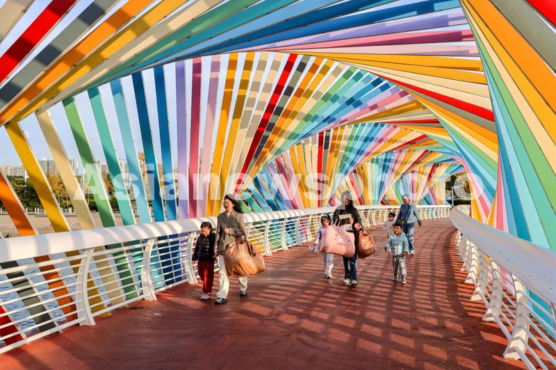 2024年11月4日,山东青岛西海岸新区唐岛湾畔的彩虹桥七彩斑斓,游人行走观景。