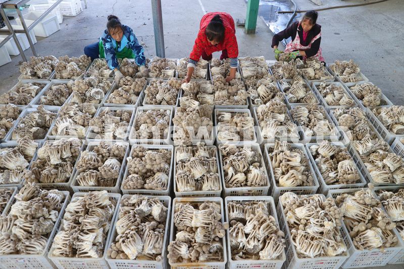 图片说明:2024年11月3日,村民在重庆市黔江区水田乡龙桥村鹿茸菇生产基地分拣、整理鹿茸菇。