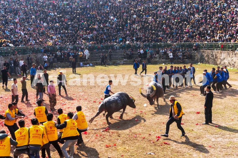 2024年11月2日,在贵州省从江县丙妹镇大塘村松学斗牛塘,人们将斗牛分开。