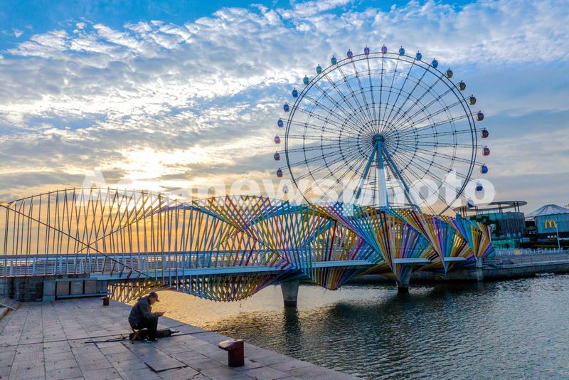 2024年11月4日,山东青岛西海岸新区唐岛湾畔的彩虹桥七彩斑斓,在深秋时节宛如凌波腾起的彩虹,靓丽缤纷。