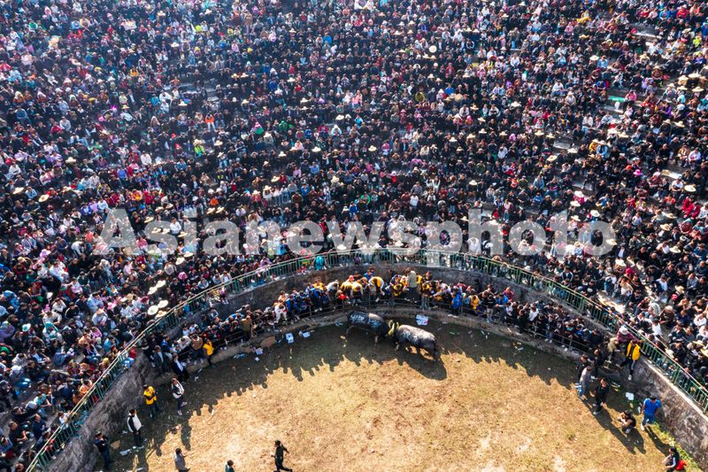 2024年11月2日,贵州省黔东南苗族侗族自治州从江县丙妹镇大塘松学斗牛塘举办传统斗牛民俗活动,吸引众多游客及周边村民前来观看,现场颇为壮观。