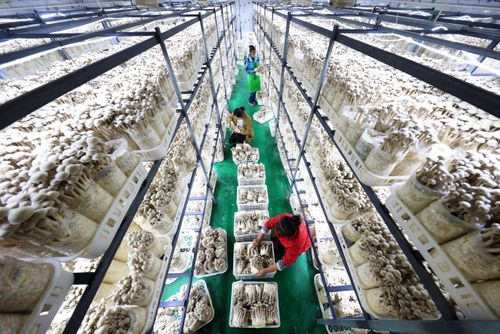 图片说明:2024年11月3日,村民在重庆市黔江区水田乡龙桥村鹿茸菇生产基地出菇库里采摘鹿茸菇。