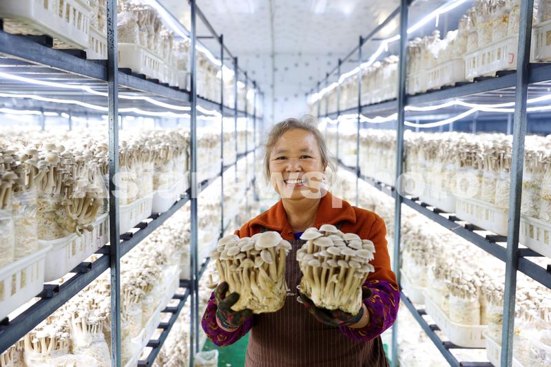 图片说明:2024年11月3日,村民在重庆市黔江区水田乡龙桥村鹿茸菇生产基地出菇库里展示鹿茸菇。