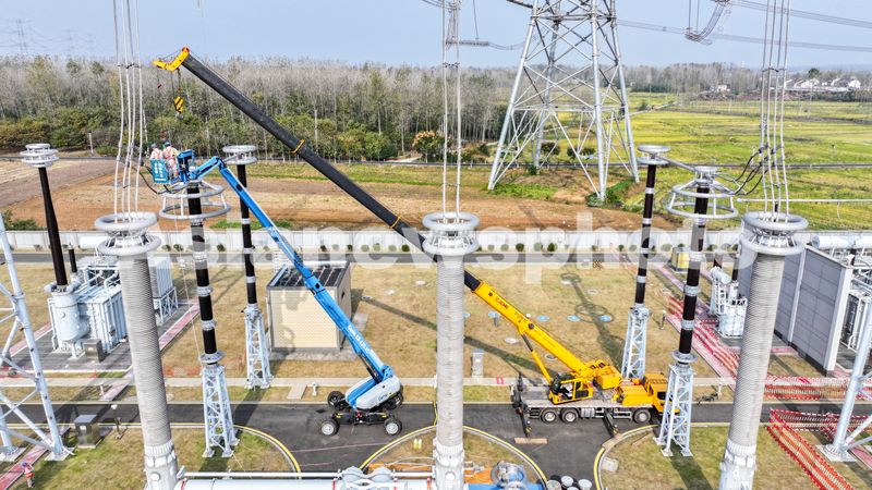 2024年11月4日,在特高压1000千伏盱眙变电站检修现场,江苏送变电有限公司检修人员正在检查避雷器绝缘环设备。