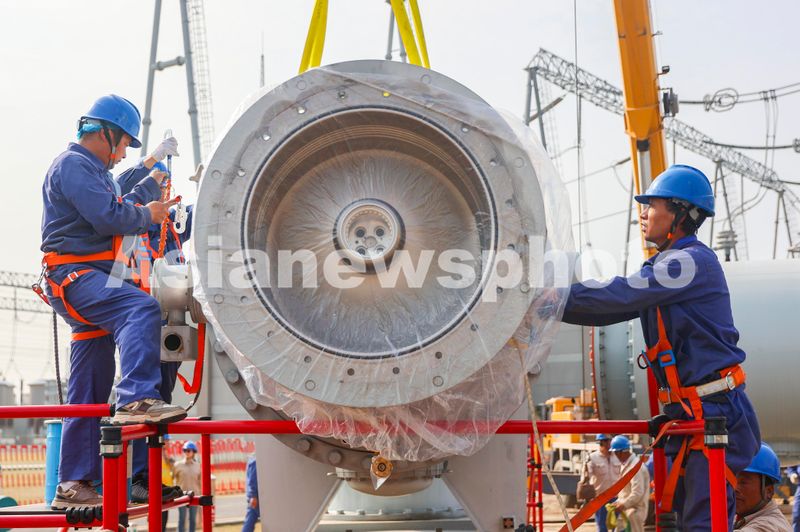 2024年11月4日,在特高压1000千伏盱眙变电站检修现场,江苏送变电有限公司检修人员正在安装断路器设备。
