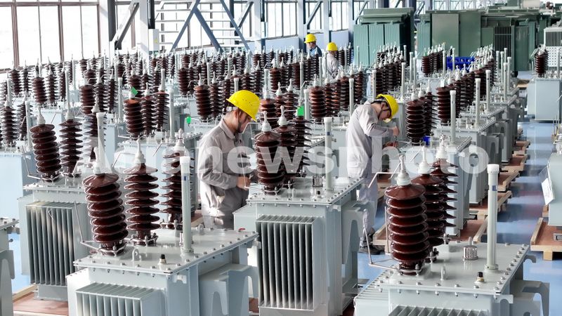 图片说明:2024年11月5日,江苏海安,在位于高新区的江苏亚威电气集团内,员工正在加紧组装新能源变压器等出口订单。