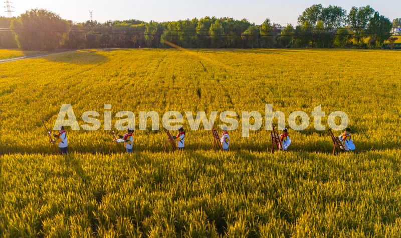 图片说明:2024年11月5日,江苏省海安市南莫镇中心小学的学生在金黄色的稻田里用画笔描绘家乡丰收美景。