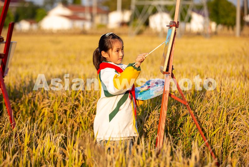 图片说明:2024年11月5日,江苏省海安市南莫镇中心小学的学生在金黄色的稻田里用画笔描绘家乡丰收美景。