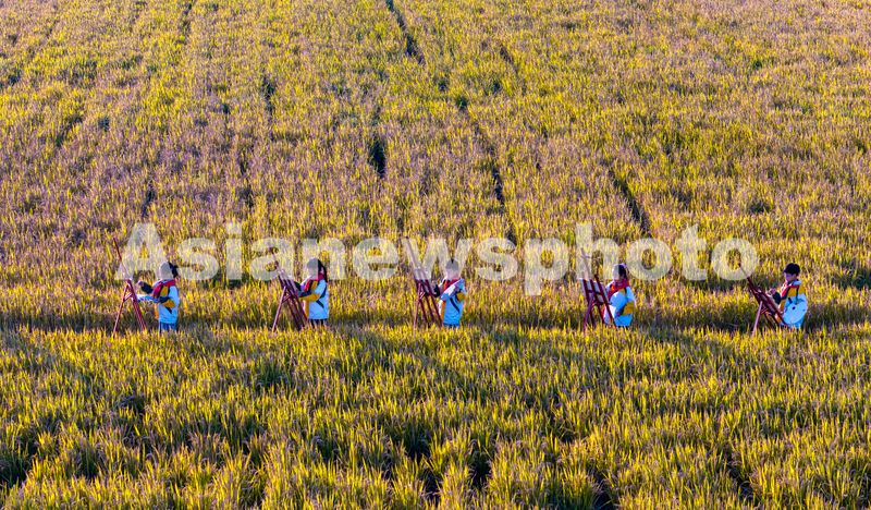 图片说明:2024年11月5日,江苏省海安市南莫镇中心小学的学生在金黄色的稻田里用画笔描绘家乡丰收美景。