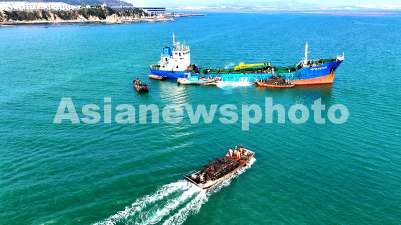 图片说明:2024年11月12日,山东省荣成市爱伦湾海域鲍鱼养殖区,养殖工人忙着往南下“越冬”的鲍鱼船只装载鲍鱼苗。