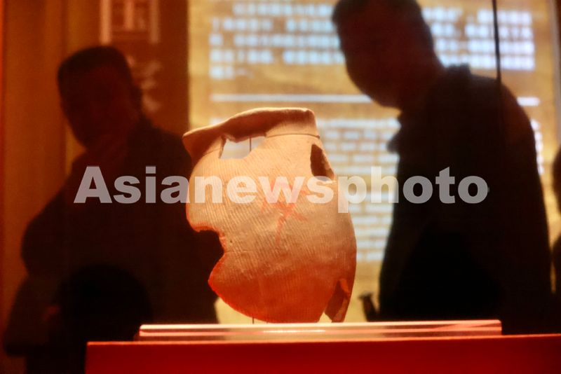 1月12日,在陶寺遗址博物馆,观众在参观展出的扁壶。