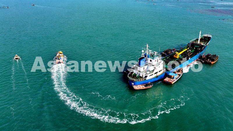 图片说明:2024年11月12日,山东省荣成市爱伦湾海域鲍鱼养殖区,养殖工人忙着往南下“越冬”的鲍鱼船只装载鲍鱼苗。