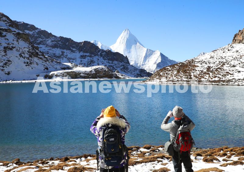 图片说明:2024年11月12日,几名游人在四川甘孜州稻城亚丁景区“牛奶海”边观赏拍摄秀雅水色翠蓝美景。