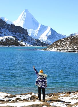 2024年11月12日,一名游人在四川甘孜州稻城亚丁景区秀雅水色翠蓝的“牛奶海”湖边拍照留影。