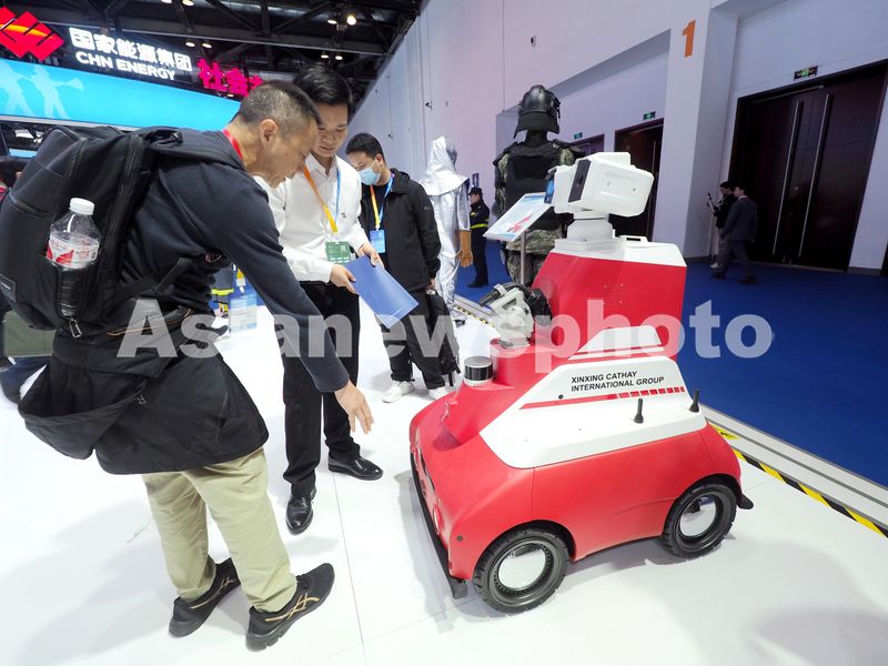 图片说明:2024年11月13日,北京国家会议中心,观众在2024中国国际应急管理展览会上参观“园区智能巡检灭火机器人”。