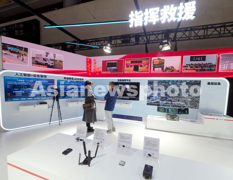 图片说明:2024年11月13日,北京国家会议中心,观众在2024中国国际应急管理展览会中国联通展位上参观“指挥救援系统”。