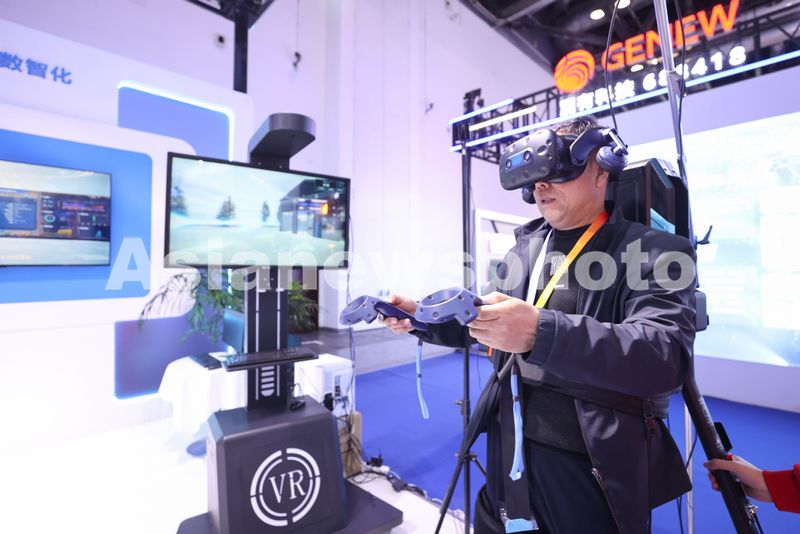 图片说明:2024中国国际应急管理展览会,参观者通过VR虚拟现实体验应急救援。