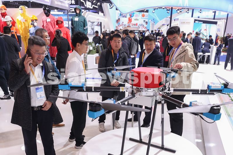 图片说明:2024中国国际应急管理展览会,参观者在观看小型旋翼无人机。