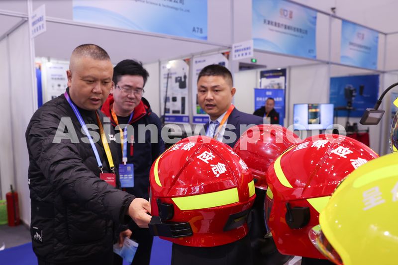 图片说明:2024中国国际应急管理展览会,参观者在观看智能应急消防头盔。
