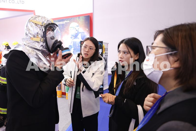 图片说明:2024中国国际应急管理展览会,工作人员在介绍防护面具。