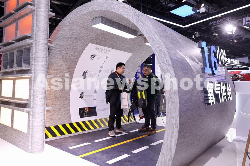 图片说明:2024中国国际应急管理展览会,参观者在观看氧气呼吸器。
