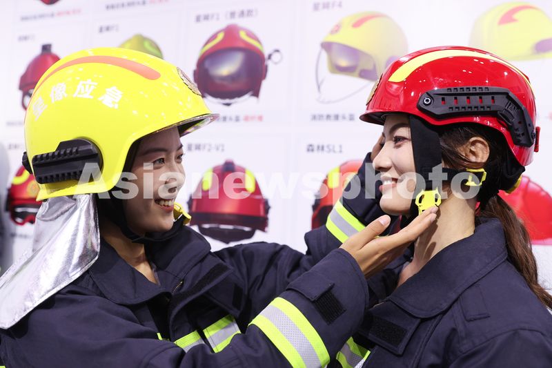 图片说明:2024中国国际应急管理展览会,礼仪小姐演示佩戴消防救援头盔。